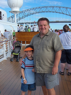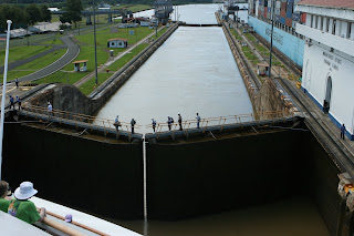 OK, enough facts, how about some pictures? We got up on the top deck just as the ship was heading under the Bridge of the Americas. It was crazy in the front of the ship, people had camped out all night just to be in the front! We headed to the back of the ship, to the Deck 7 Aft viewing platform, a little-known deck that Brandon and I had found through some exploring the day before. This is the furthest back on the ship you can get without having a private room with a balcony. We stayed here because there was a great view of the locks as we moved through, without all of the people. We figured that this was the view that the people on the May cruise heading west camped out for!