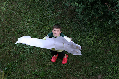 In the last day Brandon has started making airplanes. Not the usual little paper airplanes, but large onese with sticks and paper and tape and some lego ladders. This one has already survived multiple “flights” off of the balcony onto the grass below.