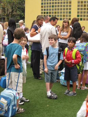 Reconnecting with friends while waiting in line. It’s nice that he knows most of the kids in his class!