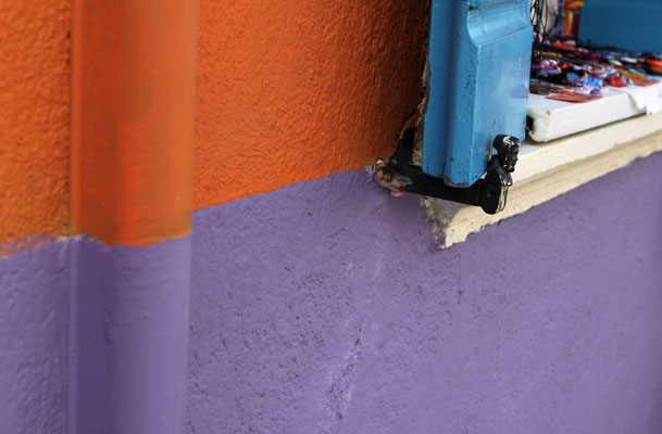 Today my son Brandon picked out the picture for the post. This is part of a building and window in, where else, Burano! I loved the bright, unlikely color combination and the hint of the items for sale in the shop window.