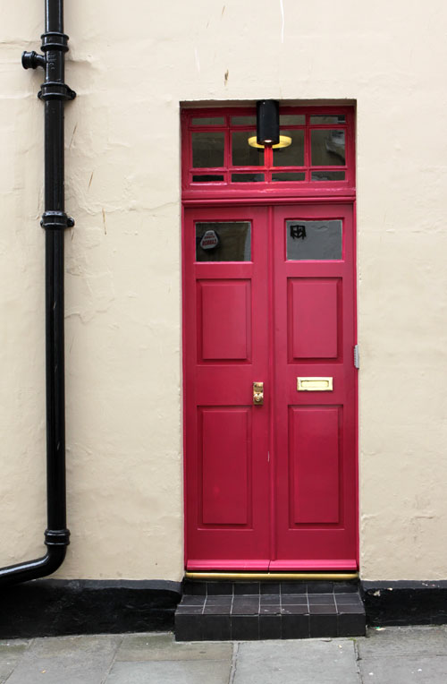 Take this door. On it’s own, it would just be a door in a wall of a building in Bath. That could be it, but look at how much personality the creator and the current owner have given it… obviously, color – bright pink! And style, it opens in two halves. And the touch of the pane window at the top with the lights both inside and out is nice. Also look at the tile on the step, no bare concrete here! The black drain pipe adds personality too. It could be painted to blend in with the wall but instead it’s a dramatic design statement, along with the black at the bottom of the wall, giving interest to an otherwise bare wall, setting off the door.