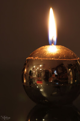 So here it is, a bright and shiny candle today, brought to you by me and my trusty assistant. Can you make out our apartment, in reflection?