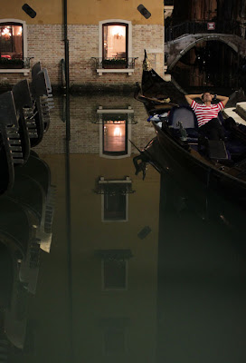 The night is so quiet and still, you almost have to hold your breath for fear of making a ripple in the water and ruining the scene. The lone gondolier on duty rests silently in his craft. He has nothing to do, other than wait for customers to appear for a midnight gondola ride. His daydreams and night dreams drift off into infinity like the reflections in the water. Just waiting. Someone will come.