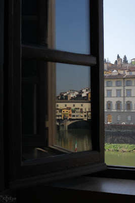 A small reflection of the Ponte Vecchio (old bridge) in Florence, reflected in a window of the Museum of the History of Science. At first glance, you might only see the window, the buildings and the river. You have to look closer to see the reflection of the bridge.