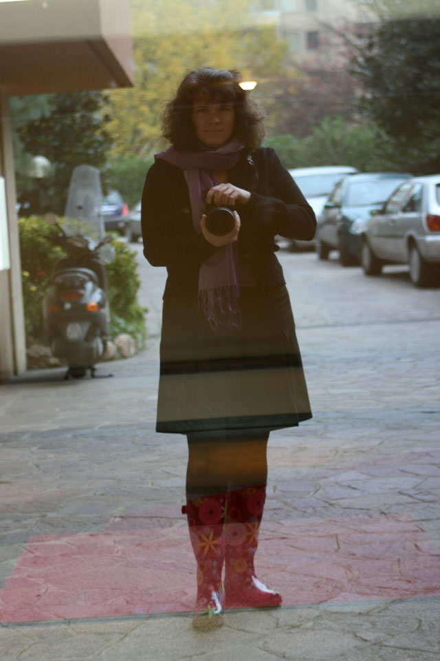 Here is another reflection of an entrance, a self-portrait of me at our apartment building in Italy. I love the sense of place that is achieved by what is reflected in the background, along with the tiny little suggestion of what is behind the door. Not a huge fan of my pictures of myself (who is?), I also like how the reflection softens my image so that I don’t focus on all of the things I immediately see as “flaws” in a regular photograph. Maybe I’m able to better see the real me, as others see me, because it’s a reflection.