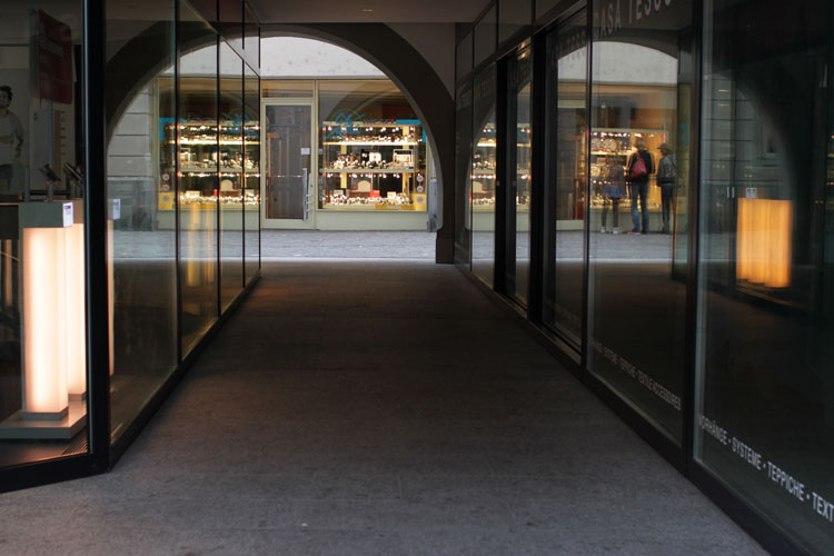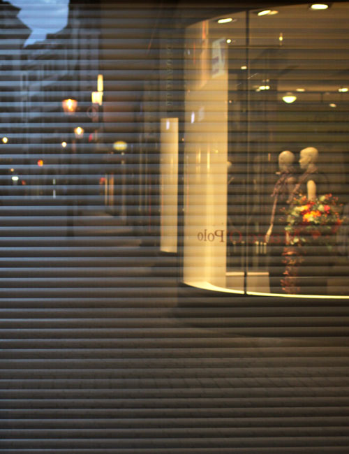 If there is something immediately behind the glass, you can get really cool effects in your reflections. The security door immediately behind the glass in this photo enabled me to get an uninterrupted scene of the reflected street in Lucerne but with a really unique texture.