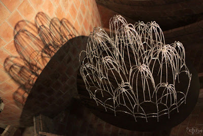 The image I showed yesterday is the mirror reflection of a grouping of chains that GaudĂ used to design a cathedral. The hanging chains form a series of loops that become arches and domes when viewed in reflection. The whole set up of this exhibit was very neat, with the mirror and the shadow on the wall to help illustrate the concept. Here are is an image of the chains “right side up” to help you see what you were looking at.