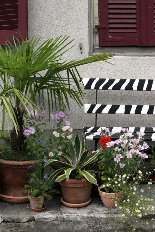 Perhaps you were thinking that upon my return from Switzerland, you would see grand vistas of the alps? Snow capped peaks and high alpine meadows? Yes, those are somewhere in my pile of files. But what I wanted to share first is the zebra bench. This is something that stuck in my head. I loved this bench, and the plants around it, that I found wandering in Unterseen and Interlaken. I had a great time photographing it, studying it from different angles and compositions while Patrick and Brandon waited for me. There is nothing like a scene like this to give me a wonderful creative burst, and I knew I would love at least one of the photos I took.