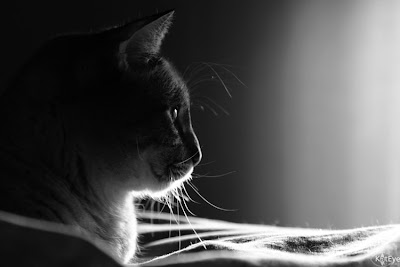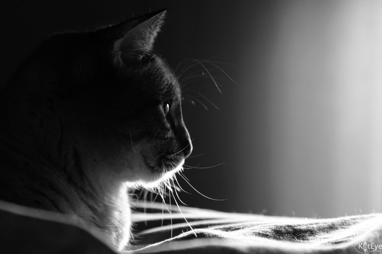 This image of Stevie, my cat, is exposed to show the details highlighted by the rim light. I had all of the elements I needed to capture an image rimmed with light: sunlight coming through a window on the right, and a background in shadow. I put myself on the same level as the subject, and moved around left to right to experiment with the background that would give the best contrast while not losing the rim light. You can see how the light coming in the window curtains behind dramatically drops off and creates a dark background to contrast with the rim light. Converting this image to black and white helps keep the focus on the light and dark contrast and not the brightly colored blanket under Stevie.