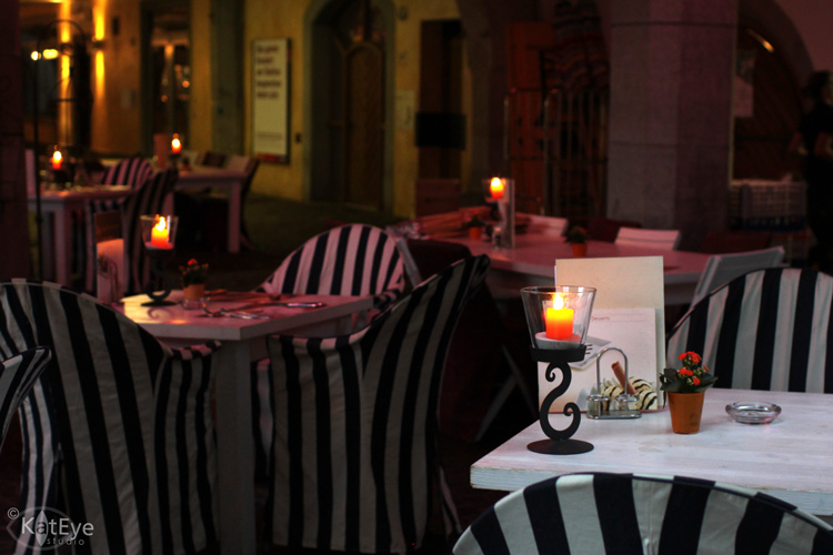 Night is a wonderful time to catch little details, illuminated with soft light. In wandering around Lucerne one evening, I saw this waterfront restaurant, tables set up for the night. Candlelight is a wonderful source of nighttime illumination. A simple candle on a table transforms the scene, giving warmth to the black and white color scheme.