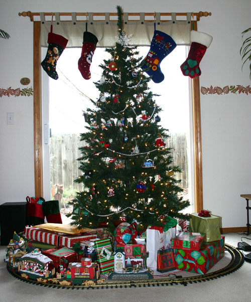 Since Brandon’s birth, we’ve always hung four stockings with care – one each for Patrick, Brandon and me, plus one “paw” stocking for Tasha. I dug in my archives to find a picture of it, this was the best I could do from Christmas 2006. You can see the paw stocking there, balancing out the odd three for the humans in the family to an even four.